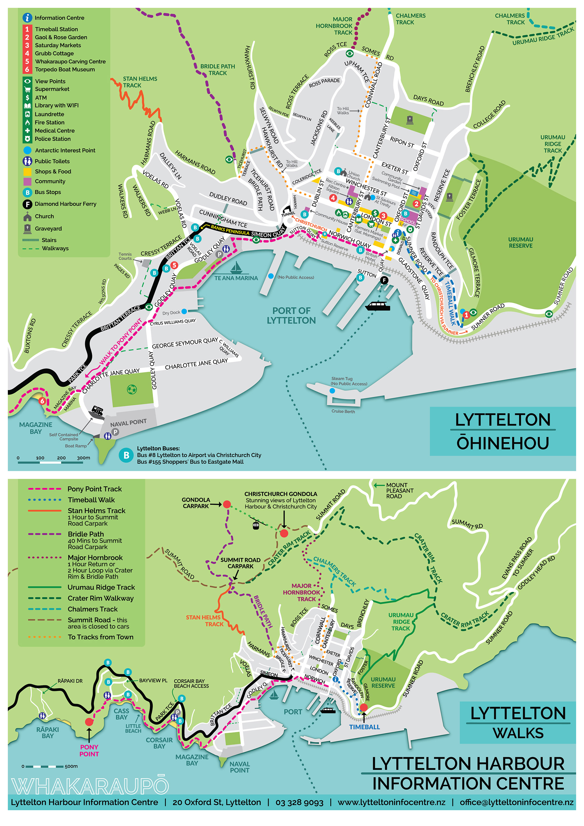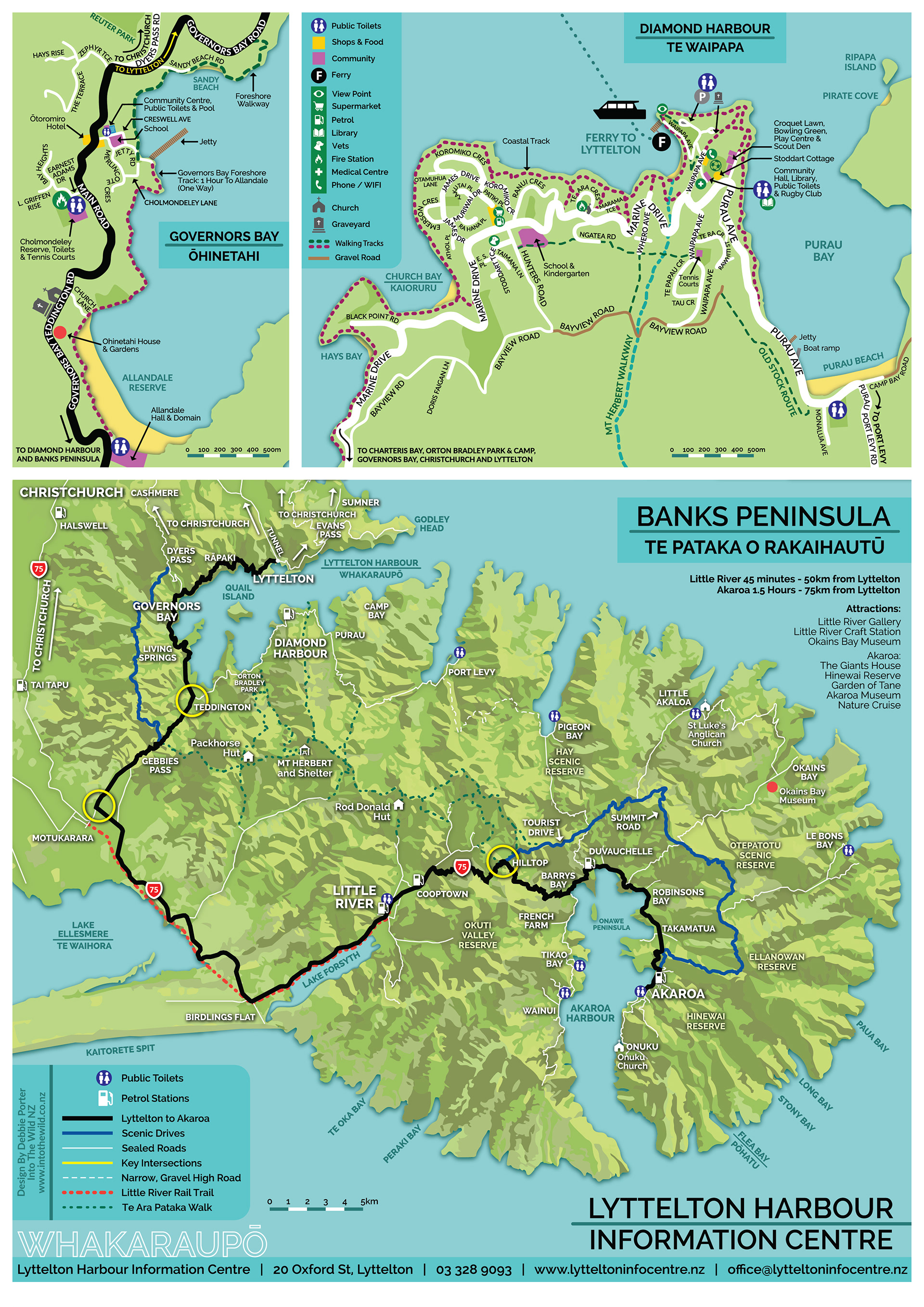 The Lyttelton Harbour Information Centre needed to update their map. So we started fresh, making a larger version which included the local walks, and main tourist drive between Lyttelton and Akaroa. This A3 map sits on their desk in a tear-off pad format for visitors to take with them on their travels.